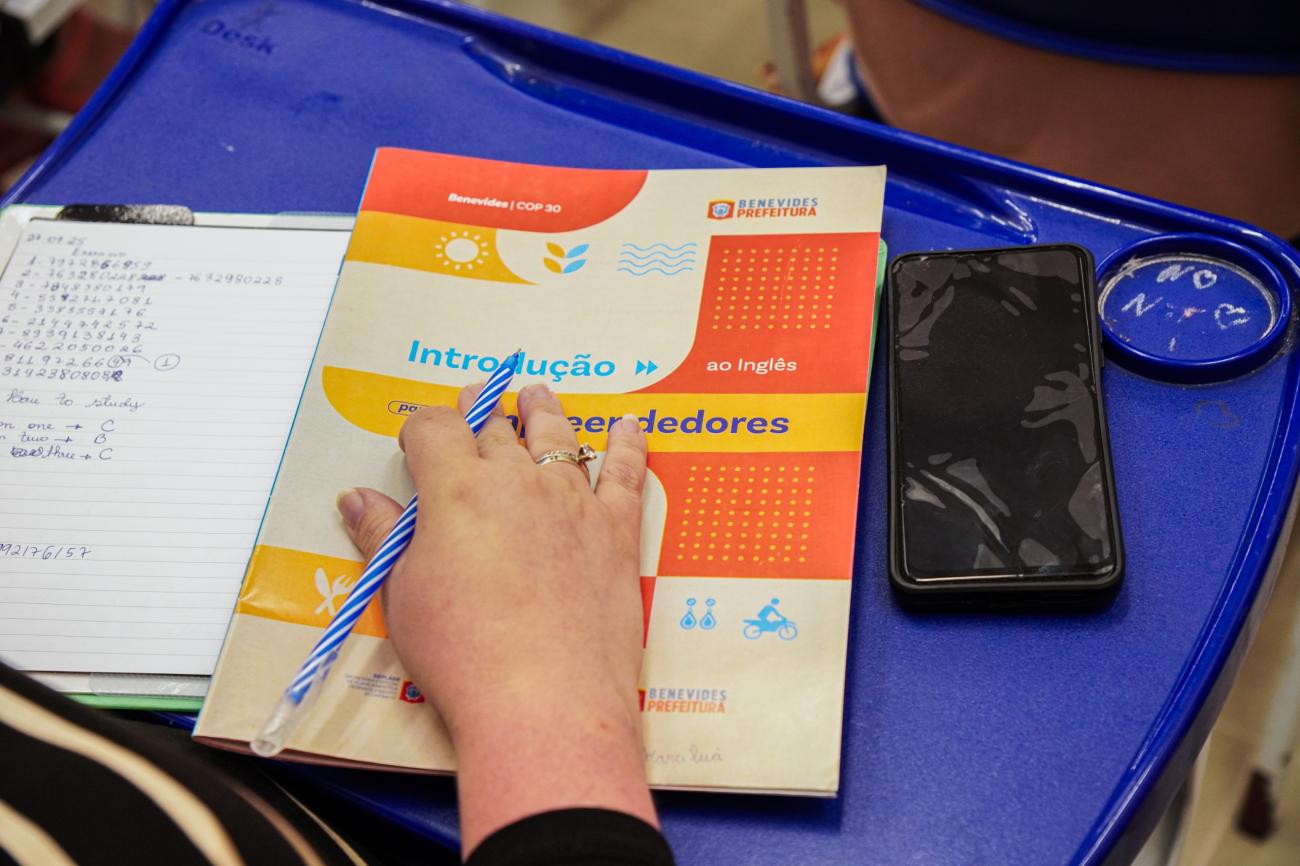 A Prefeitura de Benevides foi além e criou um livro de inglês exclusivo para o curso da COP 30. O material é impresso e focado no dia a dia da cidade, com ilustrações e textos sobre os pontos turísticos e situações comuns de Benevides, garantindo um aprendizado 100% contextualizado para acolher os estrangeiros.