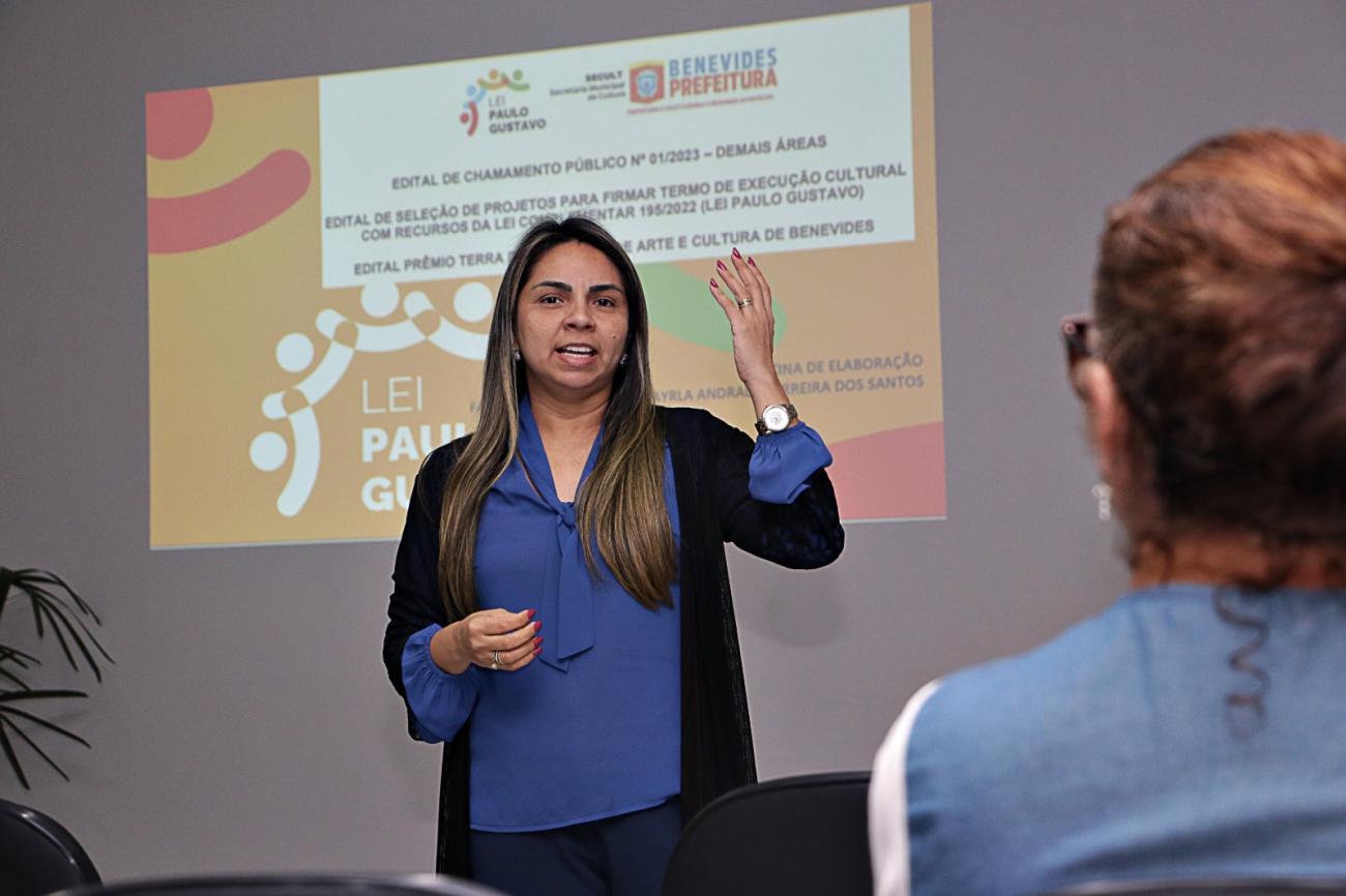 Nos dias 12 e 16 de agosto, a cidade de Benevides recebeu duas enriquecedoras oficinas voltadas para aqueles que desejam desenvolver projetos nas áreas audiovisuais e de arte/cultura, para a Lei Paulo Gustavo. As oficinas, que aconteceram no Auditório Breno Cardoso, da SEMTEPS, foram ministradas pela Profª Drª Mayrla Andrade, da UFPA, e tiveram como objetivo fornecer orientações e diretrizes fundamentais para a criação e apresentação de propostas de qualidade e aderentes aos requisitos da lei.