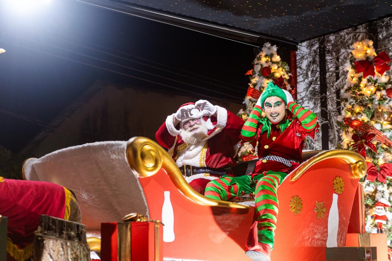 As luzes e a música foram se aproximando e, finalmente, ali, bem na frente das crianças, jovens, adultos, idosos e famílias inteiras, estavam os caminhões. No veículo central, simulando uma grande sala de estar, a figura mais esperada da noite: o Papai Noel. As crianças pularam, bateram palmas e acenaram. E todo o trajeto da caravana pelas ruas e praças foi assim, cheio de alegria. "Tudo muito lindo!", elogiou a estudante Karen Luísa.