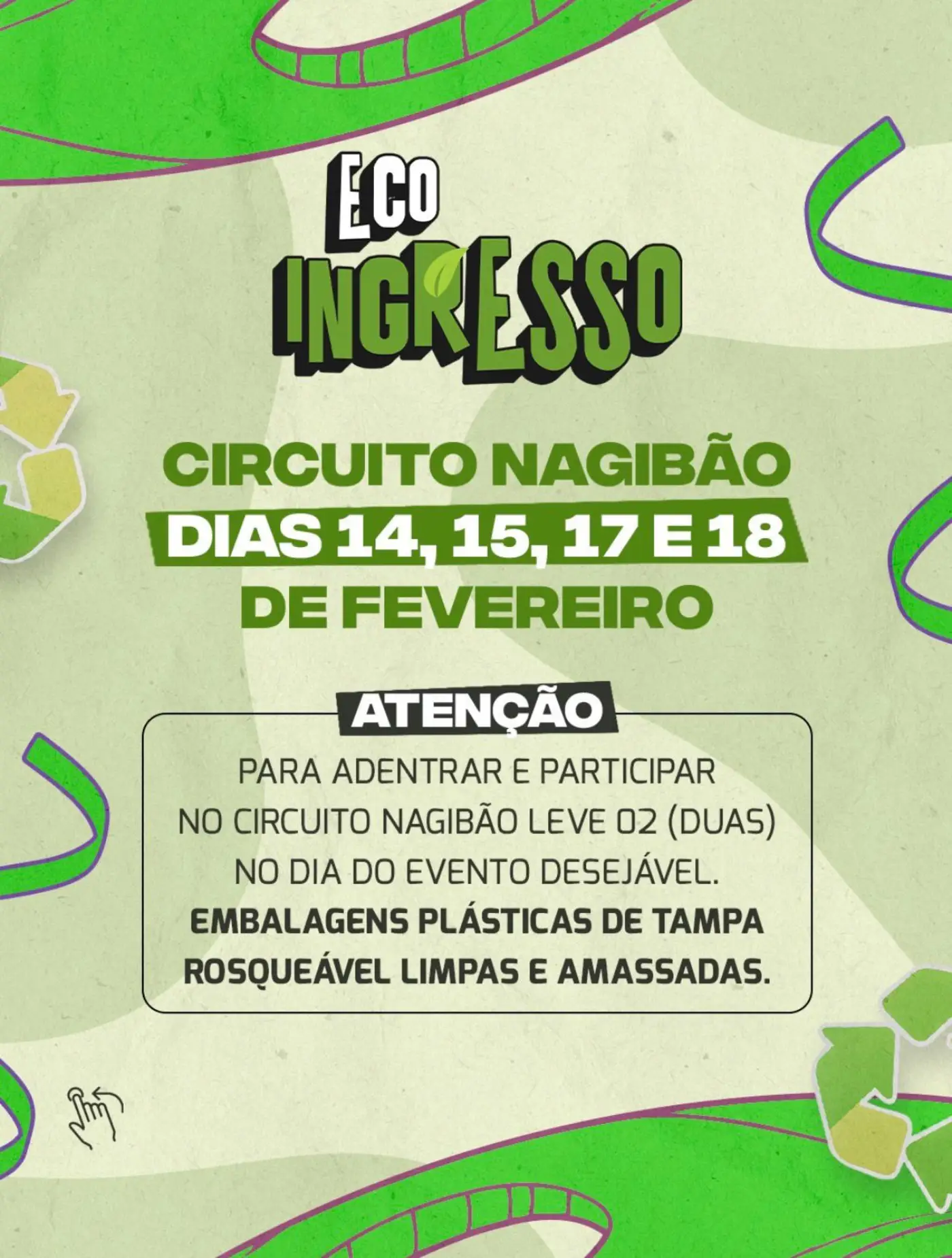 Eco Ingresso (Circuito Geral): Para quem deseja curtir a pista com consciência, basta levar 02 embalagens plásticas (também limpas e amassadas) diretamente ao acesso do circuito no dia em que deseja participar.