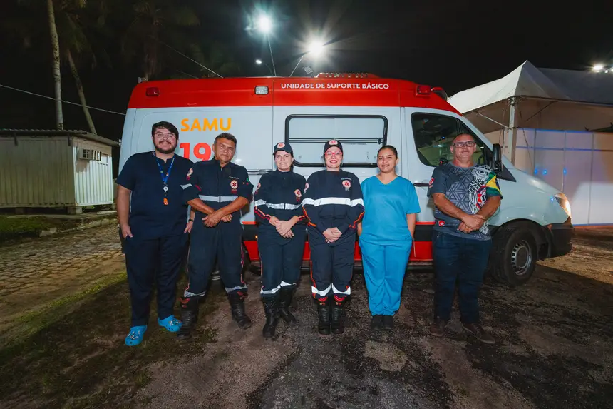 A equipe do SAMU 192 está de prontidão em pontos estratégicos para garantir atendimento ágil e humanizado a todos os brincantes.
