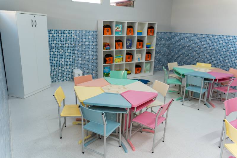 Estrutura completa: Detalhe de uma das salas de aula do novo anexo, com mobiliário e decoração pensados para o acolhimento e o aprendizado das crianças.
