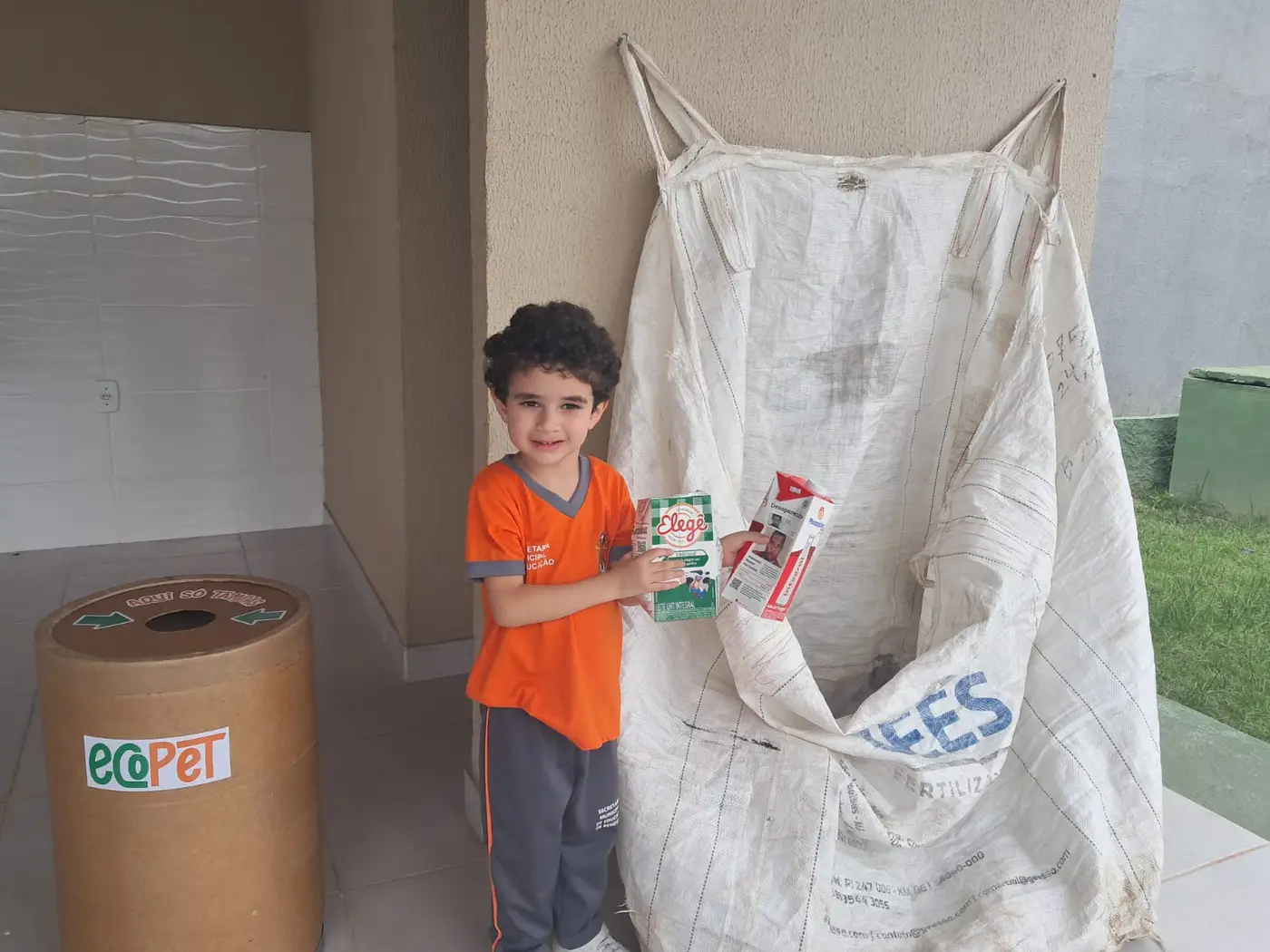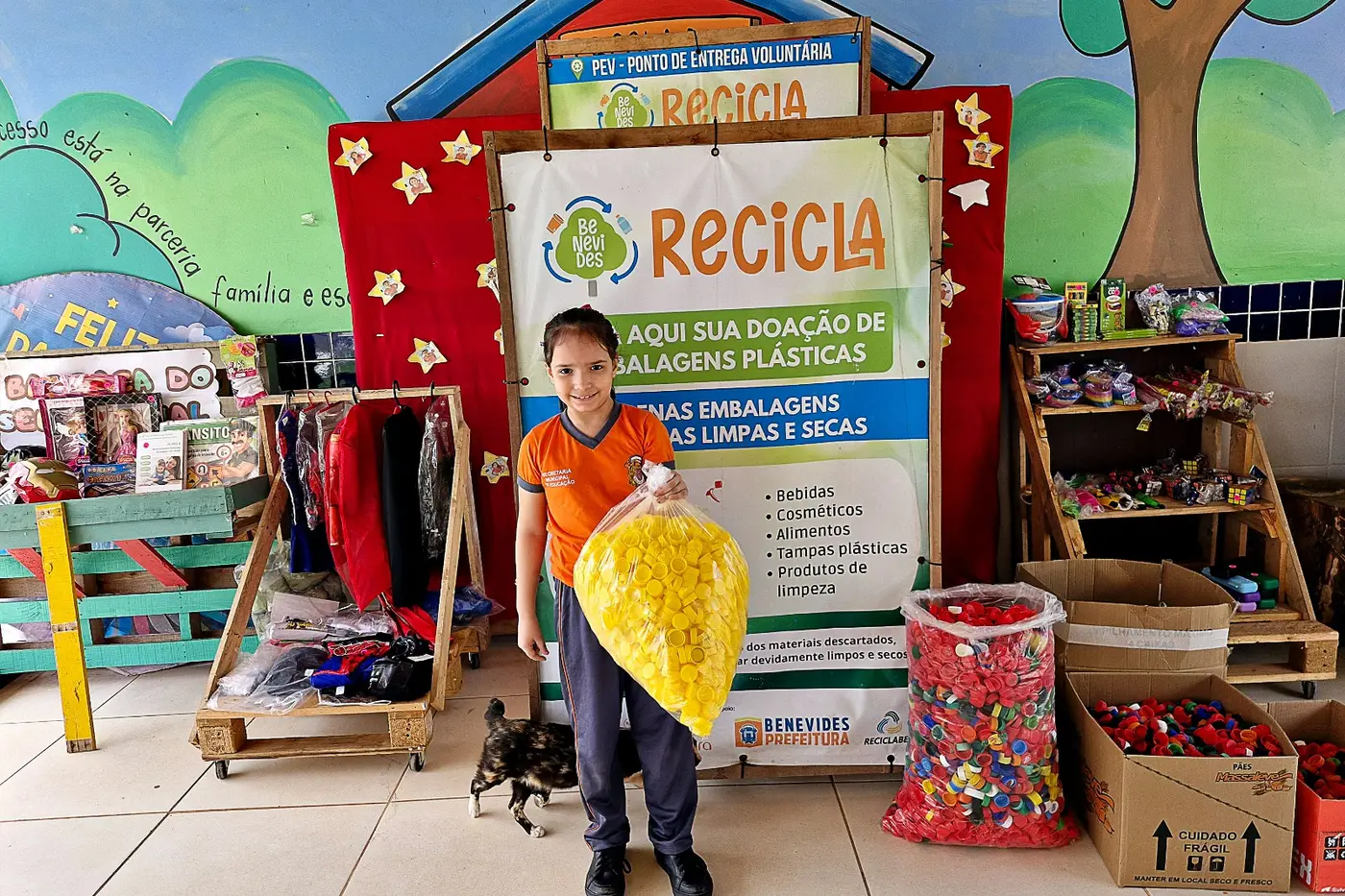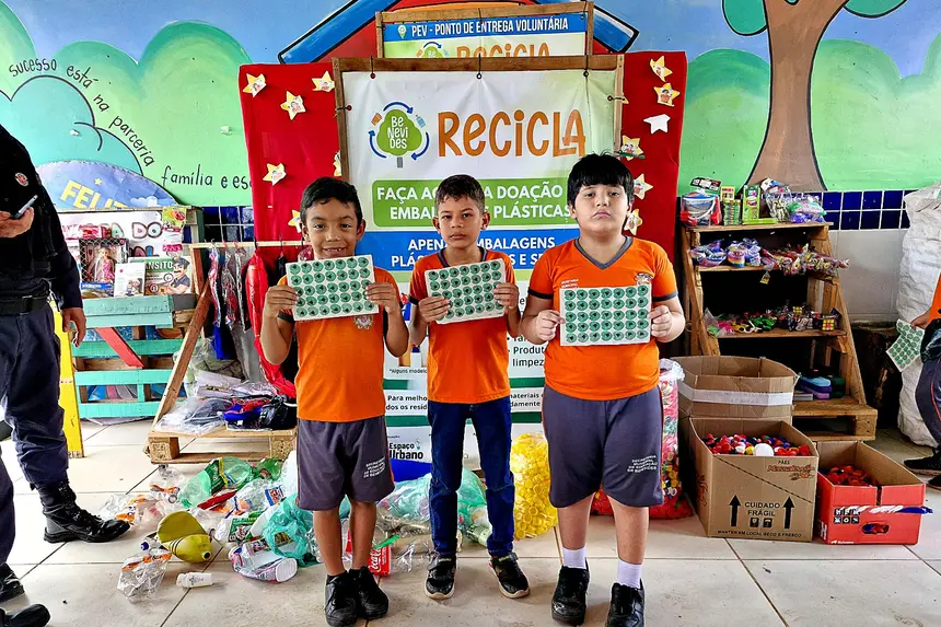 As crianças ajudam a recolher o material reciclável e ainda trocam por Ecomoeda pra adquirir produtos escolares, por exemplo.