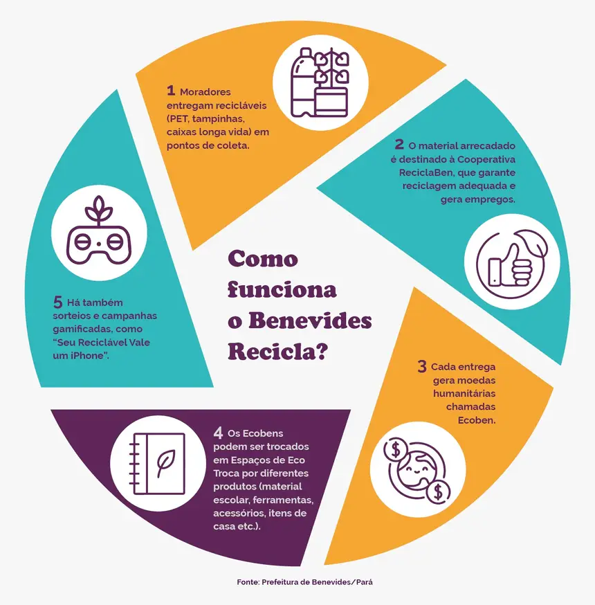 A Cooperativa Reciclaben, por exemplo, é o motor da economia circular de Benevides, garantindo emprego e renda para os catadores de recicláveis. Eles são parte essencial do programa ″Benevides Recicla″.
