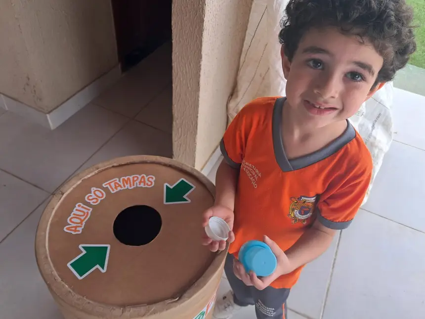 O pequeno Lorenzo (4 anos), recolhendo as tampinhas de plástico. Pequenos gestos, grandes mudanças: o Residencial Esmeralda agora é parceiro oficial da sustentabilidade.